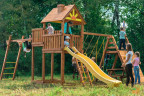 Городок отлично подойдет как для малышей, так и для детей постарше. Малыши могут поиграть в удобной песочнице. Для удобства обустроена лавочка, а для безопасности есть небольшой заборчик, который блокирует случайный выход ребенка из зоны песочницы в сторону качельной балки.
