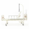 Каркас стальной с защитным эмалевым покрытием. Положение подвижных секция осуществляется с помощью червячного привода. Боковые поручни опускаются до уровня ложа. Торцевые спинки сьемные. В основании кровати предусмотрена полка для хранения санитарного устройства.